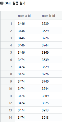 풀고나서 알았는데 Edges컬럼의 user_a_id < user_b_id는 항상 참이다. 즉 위의 CASE구문없이 user_a_id, user_b_id만 조회 했어도 됐음